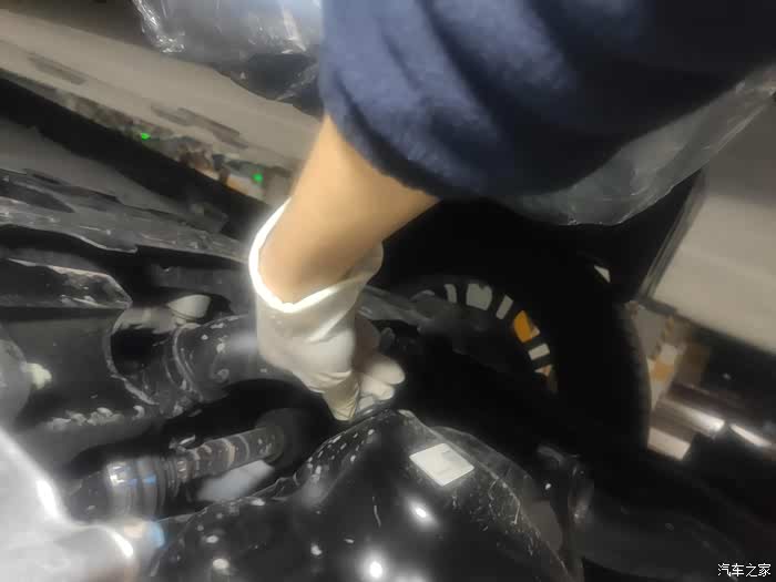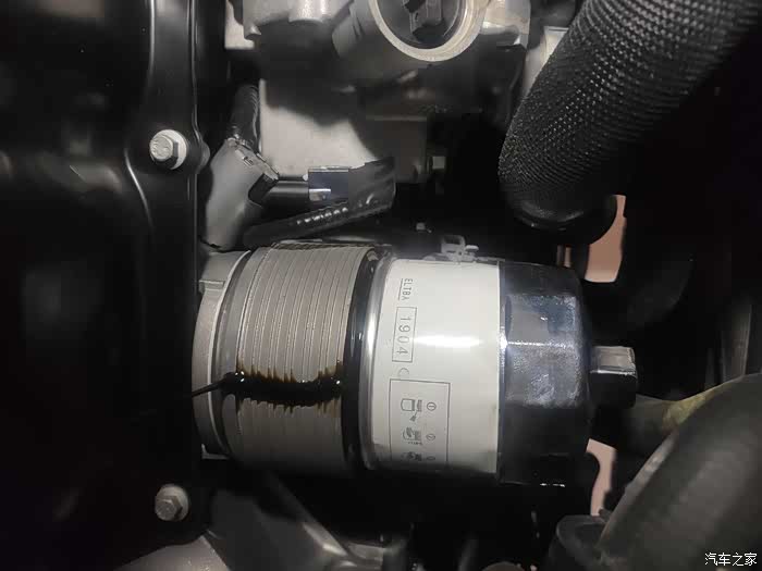 虽然我套了机滤扳手,但是我是徒手拆卸下来的机滤,带上乳胶手套,摩擦力还是很大,很好拧松。上一次首保是在4S进行的,所以安装很规范,没有上太紧。慢慢松开机滤,让机油慢慢的流,不要一下子松开。