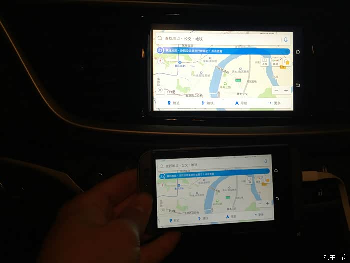 这就是我打开高德地图后横屏显示,跟车载屏幕完美投影,由于此时点车载屏幕有延迟,所以还是直接操作手机比较快,在手机上将导航设置好后就放一边就可以了---------------------------------------------------------------------