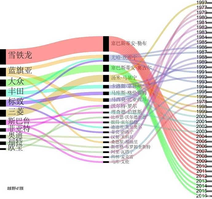 从历史数据上就能很容易地发现夺冠赛车与车手间的关系,雪铁龙(9冠)、蓝旗亚(5冠)、标致(4冠)、大众(4冠)、丰田(4冠)、三菱(4冠)6种战车的表现还是非常抢眼的,总计30个的冠军次数就足以证明。除此之外,总冠军车手的实力也一目了然,塞巴斯蒂安·勒布(9冠)、塞巴斯蒂安·奥吉尔(4冠)、汤米·马基宁(4冠)、尤哈·坎库宁(4冠),这些人无疑都是WRC的“实力大咖”!