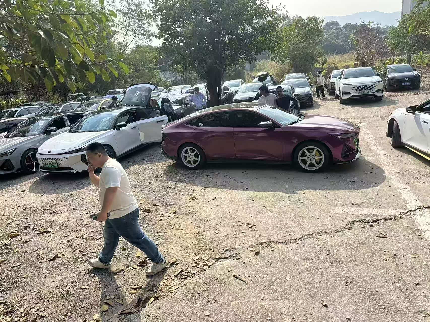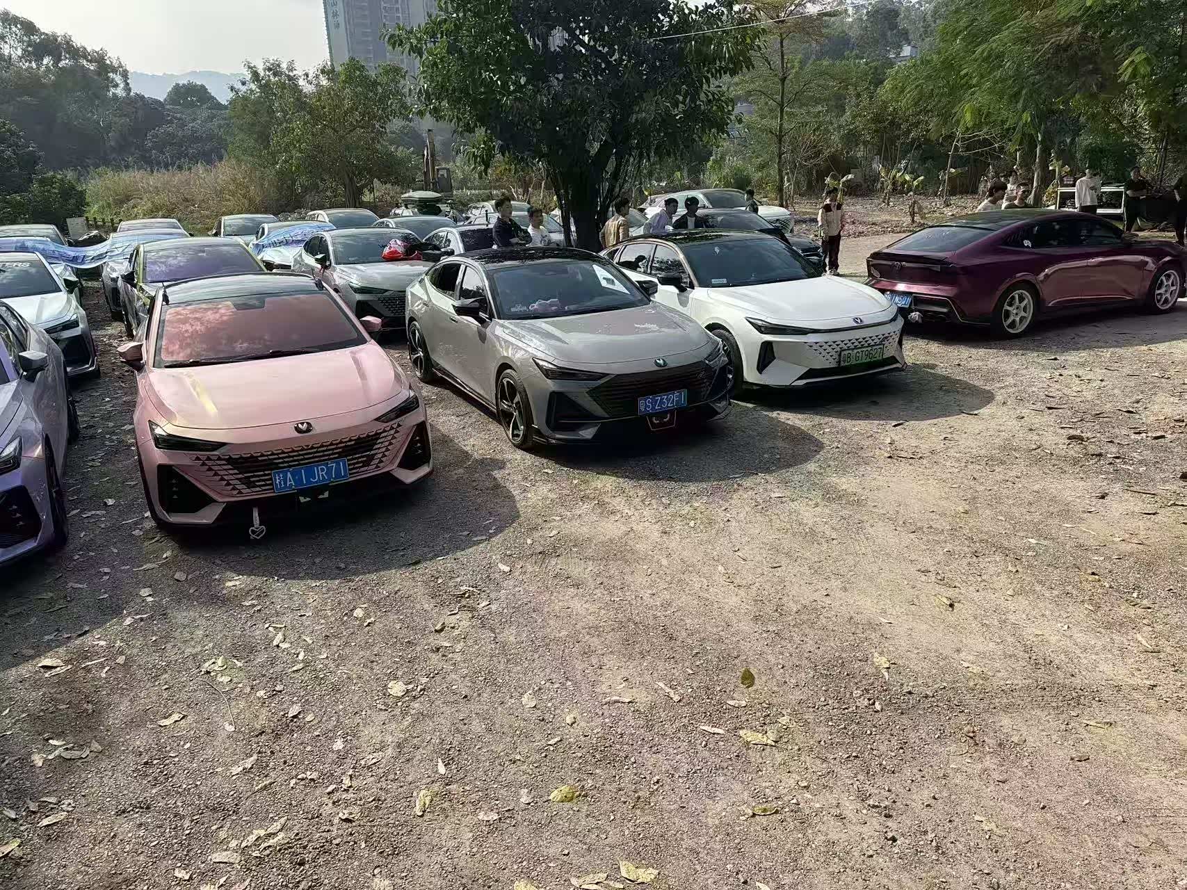 途中,几辆改装UNI-V格外抢眼,每一处细节都藏着车主的巧思与热爱,堪称移动的视觉盛宴。好几辆UNI-V的改装尤为惊艳:升级了19寸哑光黑多幅运动轮毂,辐条纤细利落,边缘点缀红色描边,转动时宛如跳动的火焰,搭配短簧降低车身高度,整车姿态瞬间变得低趴战斗,气场直接拉满;车身裹着渐变幻彩改色膜,在晨光下从粉紫缓缓晕染至银蓝,每一次转向、每一缕光线洒落,都折射出不同的璀璨光泽,宛如行走的彩虹;车窗贴了高透光熏黑膜,既保障了车内隐私,又让车身线条更显深邃立体;就连车尾的尾翼也换成了碳纤维材质,高速行驶时灵动上扬,兼顾颜值与性能,每一处改装都恰到好处。不远处的UNI-T改装也毫不逊色,换了熏黑蜂窝状轮毂,中心盖嵌了发光长安Logo,夜间点亮时辨识度拉满;车身贴了哑光水泥灰改色膜,自带低调高级感,引擎盖处点缀碳纤维纹理拉花,后视镜外壳与门把手做了全熏黑处理,轮毂内侧还喷了活力红卡钳,冷冽中透着精致,每一处细节都彰显着车主的审美与用心,看得我目不暇接,忍不住放慢车速多看几眼。