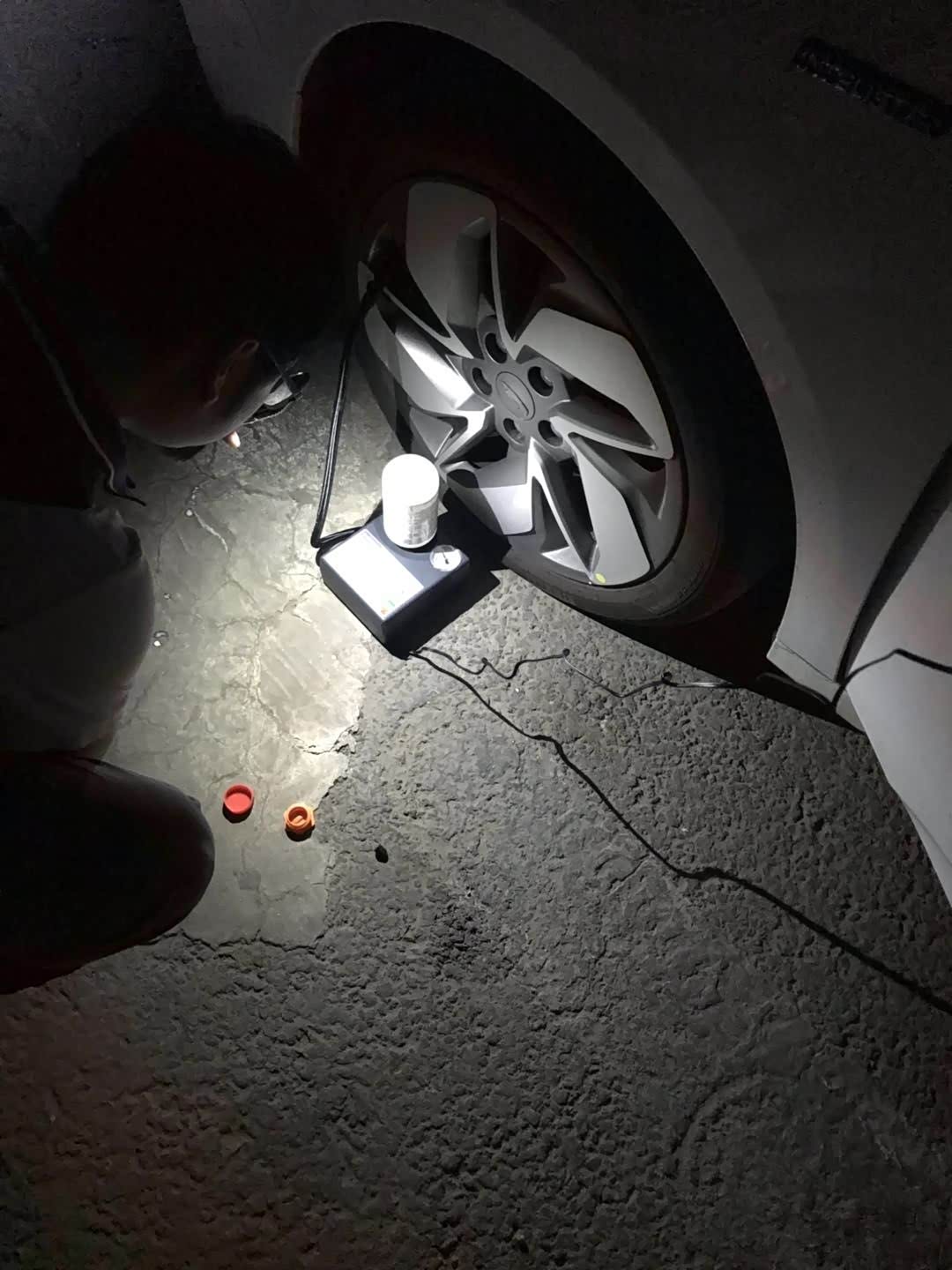 上周六,由于半夜在行驶过程中胎压突然报警,下车查看时车胎瘪的挺厉害!半夜没有修理厂,应急用了随车赠送的#补胎液# 。使用过后胎压恢复正常,按说明以低速开车回家。