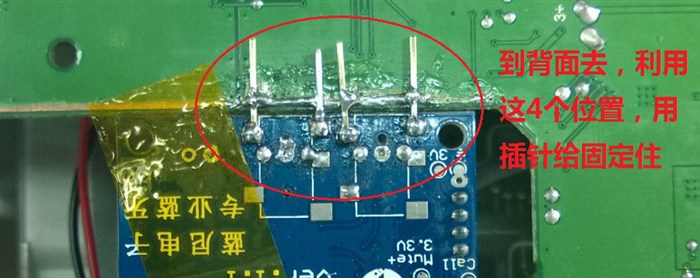 回到功放板的正面,用两个插针把地连接起来,也可以起固定作用, 另外几个信号用细线飞线解决。