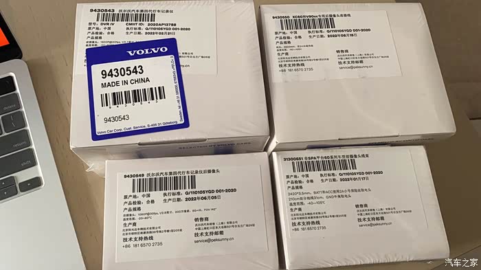 沃尔沃原厂第四代行车记录仪(前后双摄)一共有四个盒子,两盒摄像头机身,两盒线束。之前问售后顾问咨询过,我的17款XC60也能放心安装。