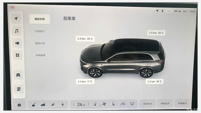 从夏天到冬天,随着温度降低,胎压一般都会比较低了,我看到有的车友胎压都只有2.0、2.1bar了,濒临1.9bar的警戒线了,个人觉得可以适度补一些胎压,稳定在2.5bar左右更合适。太低的胎压不管对驾驶、乘坐感,以及能耗都是不利的。