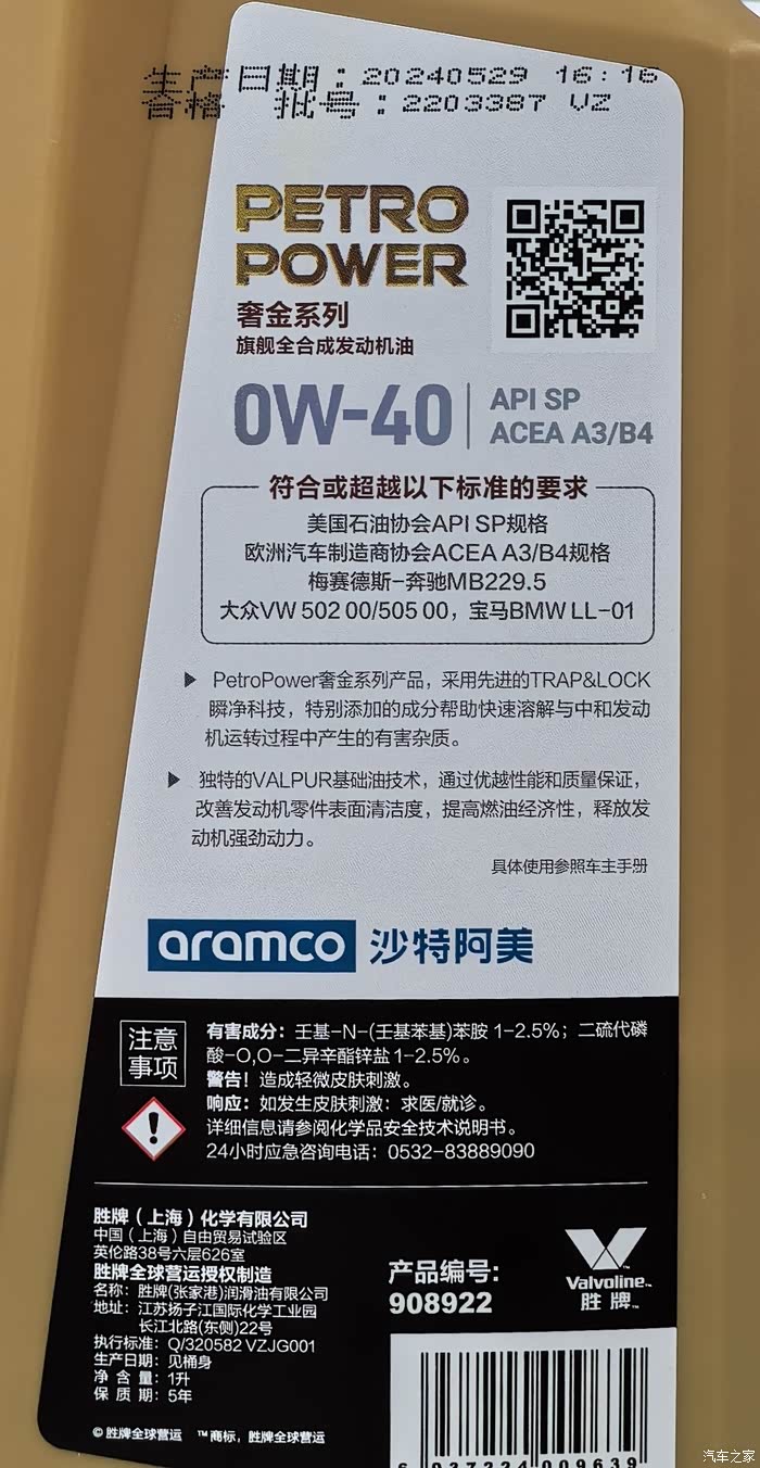 最新的API SP认证,ACEA A3B4标准,是一款中高灰分的机油,车厂认证有奔驰MB 229.5、大众VW502/505和宝马LL-01