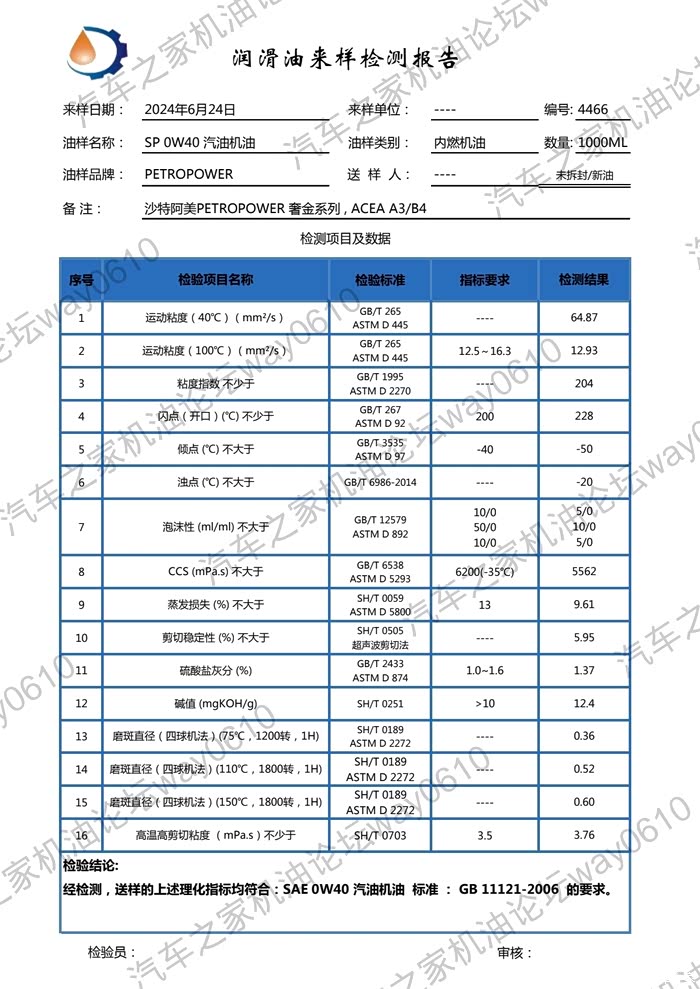 沙特阿美PETROPOWER奢金0W40实测16项指标
