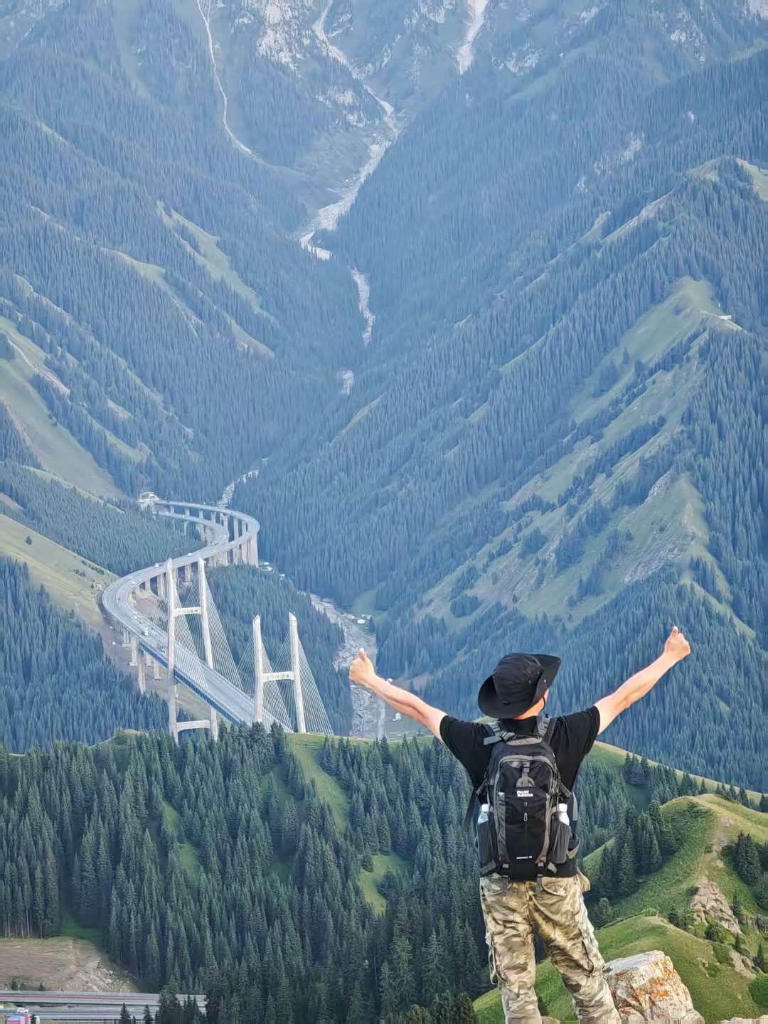我们今日行程的终点是松树头,历经五十五分钟,驾驶新H5终于抵达山顶。这一路,车辆的舒适性很不错,座椅贴合身体,长时间乘坐也不觉得累。来到山顶,突然觉得上午去果子沟观景台有些多余,这里看果子沟大桥视野更开阔,取景也更全面,就是有点费体力,其他都还行。