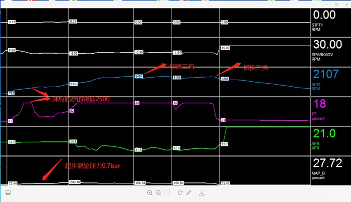 从数据流分析弹射起步的转速是2500转,弹射的的涡轮压力值是0.7bar,在三挡破百