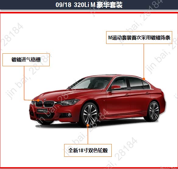 标轴的运动曜夜版升级为18寸黑色400M轮毂, 长轴的运动曜夜版得花1500才能换成黑色,默认为铁灰色,其他配置的所有3系都不能选配黑色轮毂,320iM也不可以。。。
