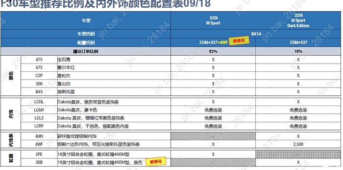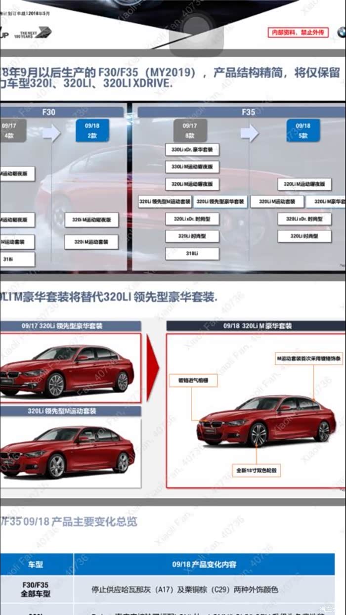 1、车型318 330 停产,标轴的19款只会有320i M跟320iM曜夜 两种车型。长轴的有320li时尚、320li Xdrive时尚、320liM运动套装、320liM豪华套装跟320li运动曜夜版5钟车型,其中320liM豪华套装会换成双色18寸轮毂。2、车身颜色所有F30跟F35停止供应哈瓦那灰和栗铜棕的颜色。3、320li时尚跟4驱320li时尚,可以花2900升级液晶仪表。注意,只有长轴的可以升级,标轴的只有曜夜有,M运动版不可以升级。。4、档杆18款的小鸡腿使用皮包裹的,但是19款改为了简洁的造型。。。并且鸡腿由银色壳换成了黑...