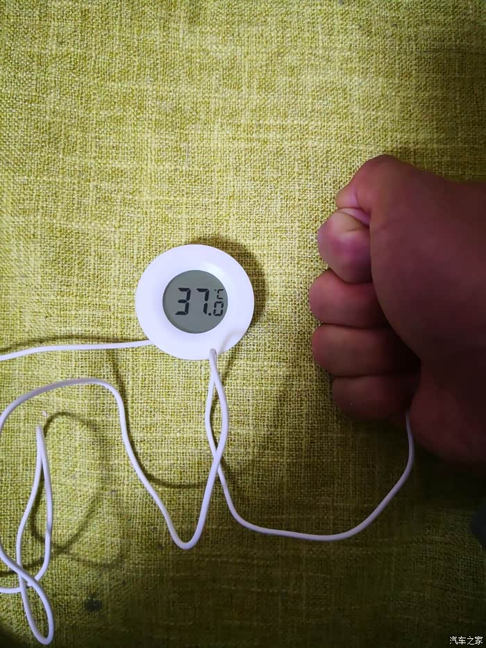 无奈只好采用最笨的方案,有人值守!将温度计放在副驾驶侧的玻璃旁边,温度探头悬空在副驾座椅上,每隔5分钟观察一下温度显示和仪表盘功率显示。就这样喂了70分钟蚊子!!!为了真理,也是献身了!