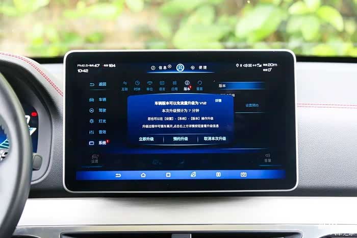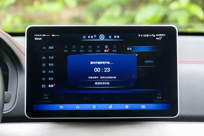 再升级车机,版本更新为V1.2。有的车机升级包迟迟不出,可以熄火重启,或者长按音量旋钮重启大屏。据说车机版本更新后,增加了高温消毒、高速120行驶保电模式、雨天自动大灯、油门更灵敏,有条件的车友可以测试下。