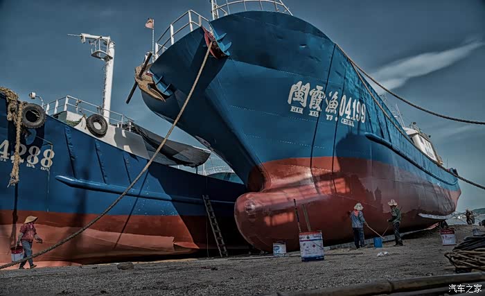 4.休渔季节渔民忙着粉刷渔船做好出海的准备。