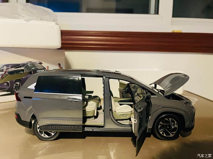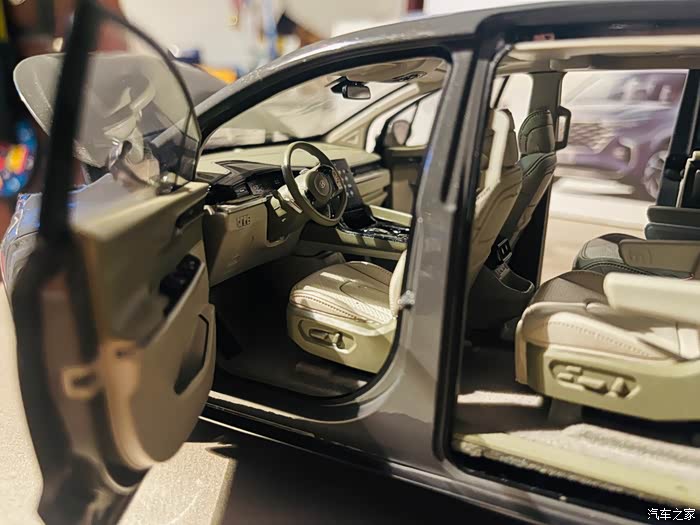 说回这款让我感到质感出色的车模,有几个让我很是惊讶的点。首先就是车门(包含侧滑门),发动机盖,后备箱盖全都可以打开。其次,周围车门,发动机盖打开后,可以看到座椅,发动机都刻画的栩栩如生,质感十足。最后我还发现这款车模后视镜居然都可以折叠,方向盘转动居然带动前轮转动,一款车模居然做的这么认真。那库斯途实车品质应该更为出色。