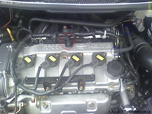 今天洗车,顺便把发动机照了下来。准备安装机油透气壶。经过比对资料(主要是根据曲轴箱强制通风及强制排气的原理)找到了以下安装的位置,最大可能的是图中红圈位置,存有疑虑的是图中蓝圈位置。请大家来参详一下!