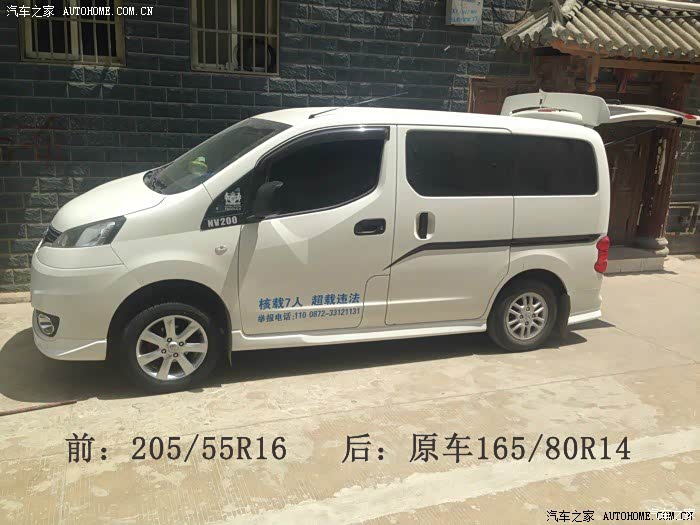 这款车最完美的配胎参数就是直接用09款轩逸的轮毂轮胎,我已经测试过了,原车轮胎车速表显示,要比实际车速慢了3.36公里,大家可以试试看,换了195/60R16胎后,车子表显示车速和实际车速一致,而且前后轮刚好齐平叶子板,简直就是专门为NV200设计的,当然,这款车的底盘本身就是轩逸的,大家如果不相信,可以亲自去试试。