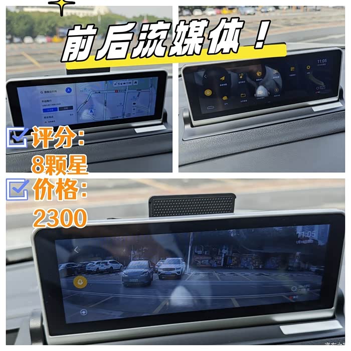我这个流媒体功能性比较多,带前后双录,以及停车监控,下雨天非常的清晰,左右两侧的盲区也能清晰的看到,以及带有语音唤醒,音乐播放,以及导航系统,可以放出无线网络提供给车内的朋友使用。