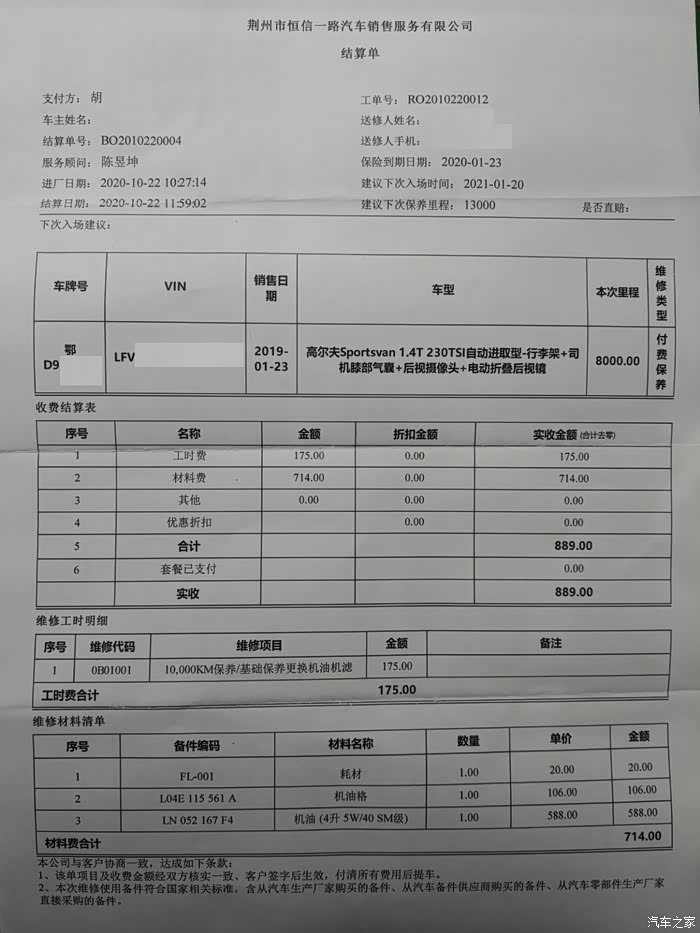 4S店常规保养,换机油和机滤,加了点防冻液。