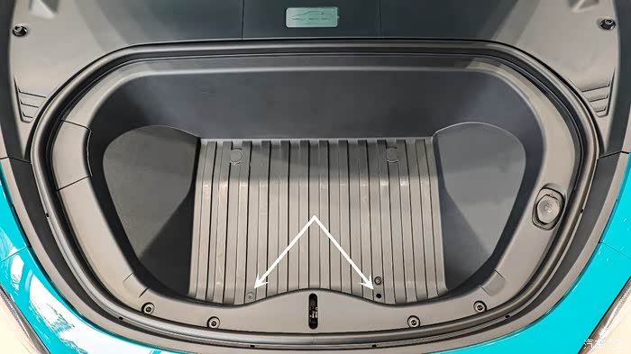 如果前备箱载物出现液体遗洒,前备箱前端左右位置各有一个过水孔,用手拔出橡胶塞即可排水,如有少量水滴残留,用布擦干即可,排水后请注意将橡胶塞复位(如图所示,右侧橡胶塞已拔出演示)。