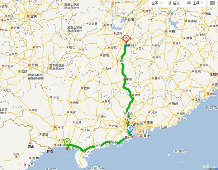 一路上走走停停,累了饿了都在服务区吃或休息,每开2-3个小时,休息一会,一个人开车,不能太疲劳驾车,高速上开车,最忌疲劳打瞌睡。路上一直开着手机百度导航,基本上是按照导航来行驶的,路线是:株洲—衡阳—永州—桂林—柳州—钦州—北海,全程近1000公里,高速:京广奥—泉南—六钦。