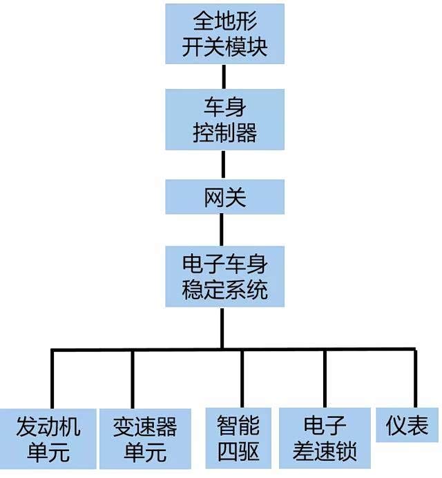 图2.全地形控制系统主体策略存放在ESP系统中,由ESP、TOD、EMS、TCU系统构成整个全地形控制系统,共同完成AUTO、ECO、运动、雪地、泥地、沙地、岩石地形模式,同时兼顾各种路面的脱困。