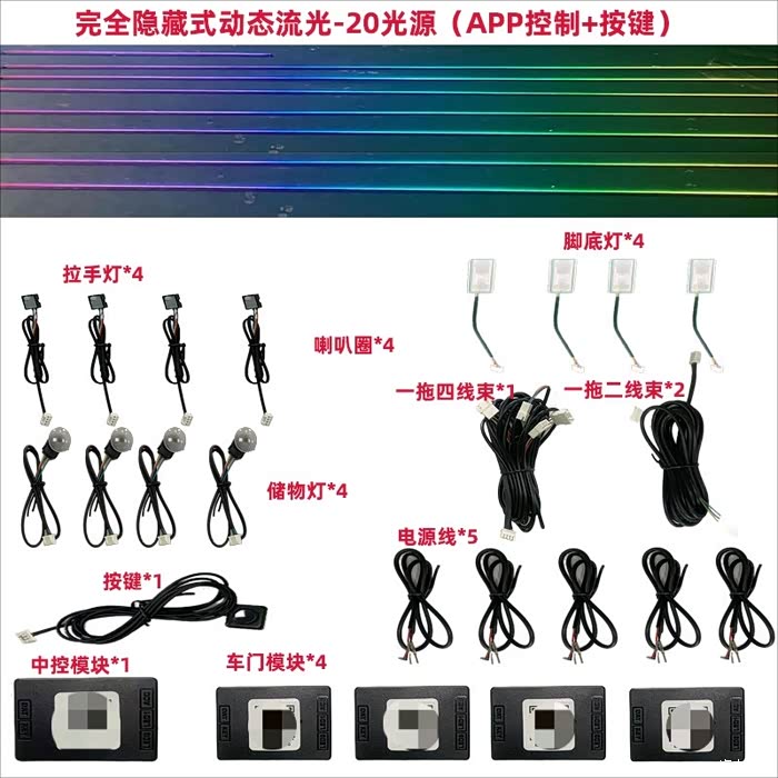 官网的灯带的包含一个中控,4个灯带,中央储物盒灯2个,脚窝灯4个,按键1个,线束若干。四个门是没有的,主要分布再中控、前档、马鞍、脚窝、顶部几个位置。而第三方的氛围灯可以自由组合,除了官网的几个位置外,还可以选择四个车门、门碗、储物箱、喇叭圈等位置,配置更丰富。