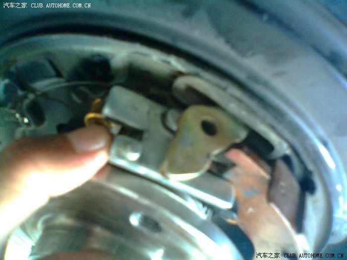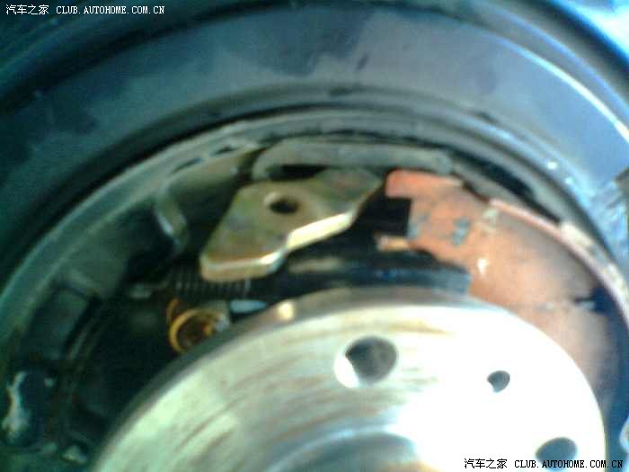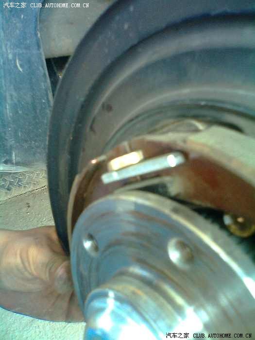 看到了图正中白色的铁片了吗?因该是用于手刹片定位的。就是它在作怪。