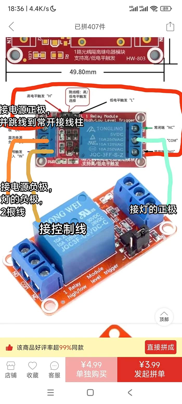 继电器的跳线默认是高电平触发,把跳线跳到L,也就是低电平触发(亮灯)