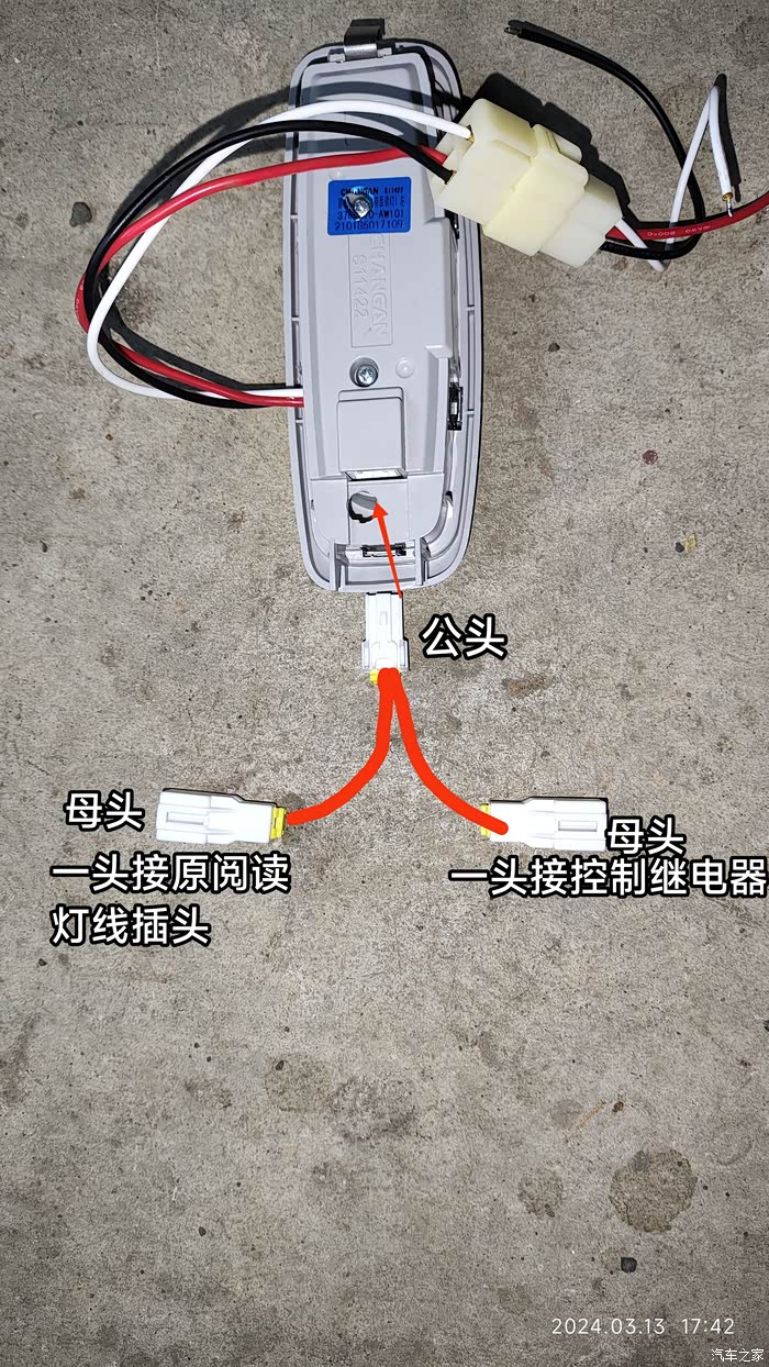 阅读灯是LED的。并不是直接根据开门关门通断电亮灯,是通过一根控制线控制灯具电路的三极管导通和截止来控制亮灯,控制信号的逻辑是:高电平截止,也就是灭灯,低电平导通,也就是亮灯,而电源线是常电,如果直接接到阅读灯的电源线上,后备箱灯就会一直亮着,所以,需要再买一个由高低电平控制的继电器控制后备箱灯的开和关。(有后备箱灯的版本可以忽略以下内容,后备箱灯条附带的线束可以直接无损接在原装的后备箱灯的插头上)。