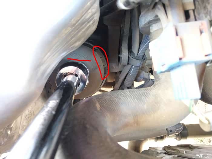 机滤盖拧松后,不要着急取出,此时机滤内会有废机油流出,最好静止一会,让机油流出一部分,否则机油会滴到其他地方。取机滤时,不要竖直往上,这样会由于旁边有障碍物而增加难度,可先移动到上图红圈处(往车头处移动)再上移。