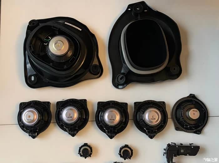 上图中左边最大的就是副驾的低音,右边空壳子是主驾的,中间五个喇叭是中音,其中四个一样的是在四门,最后一个略微大一些的是在中置。最下面是两个前门A柱附近的小高音。