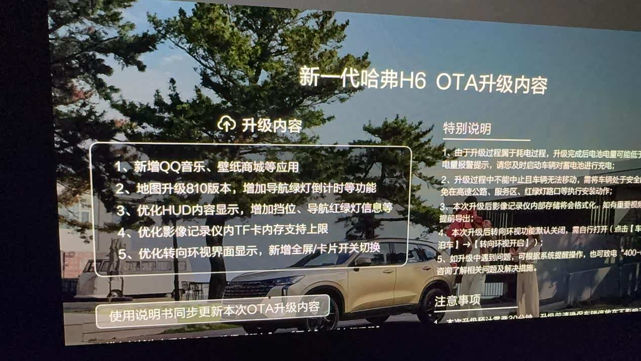 升级完成后,车机出来个介绍,说明了 一下更新的内容,哈哈,全部都是我想要的啊,包括QQ音乐,壁纸更换,HUD抬头显示丰富一下内容,这些我都在长城app留言过,嘿嘿,看来大家的需求和意见都差不多嘛。