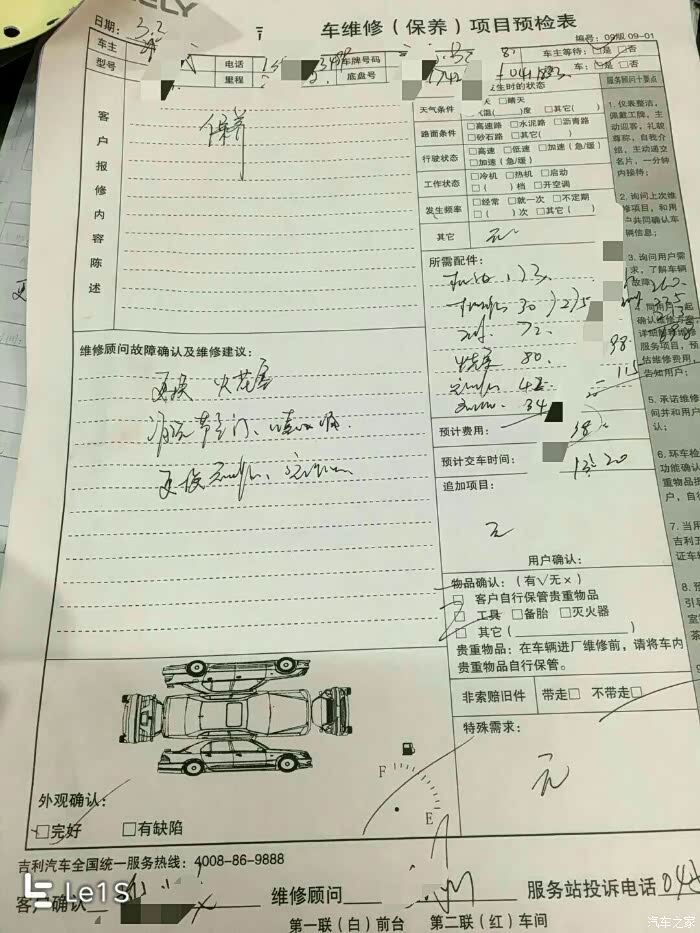 选择了一家最近的ssss店去保养,也就是换换机油,其余的也没什么,不过服务顾问接待后,给我讲解了好多知识,说实话我犹豫了,想想也是,多花点钱多维护几样,可能就安全不少,受用不少,也能多用几年