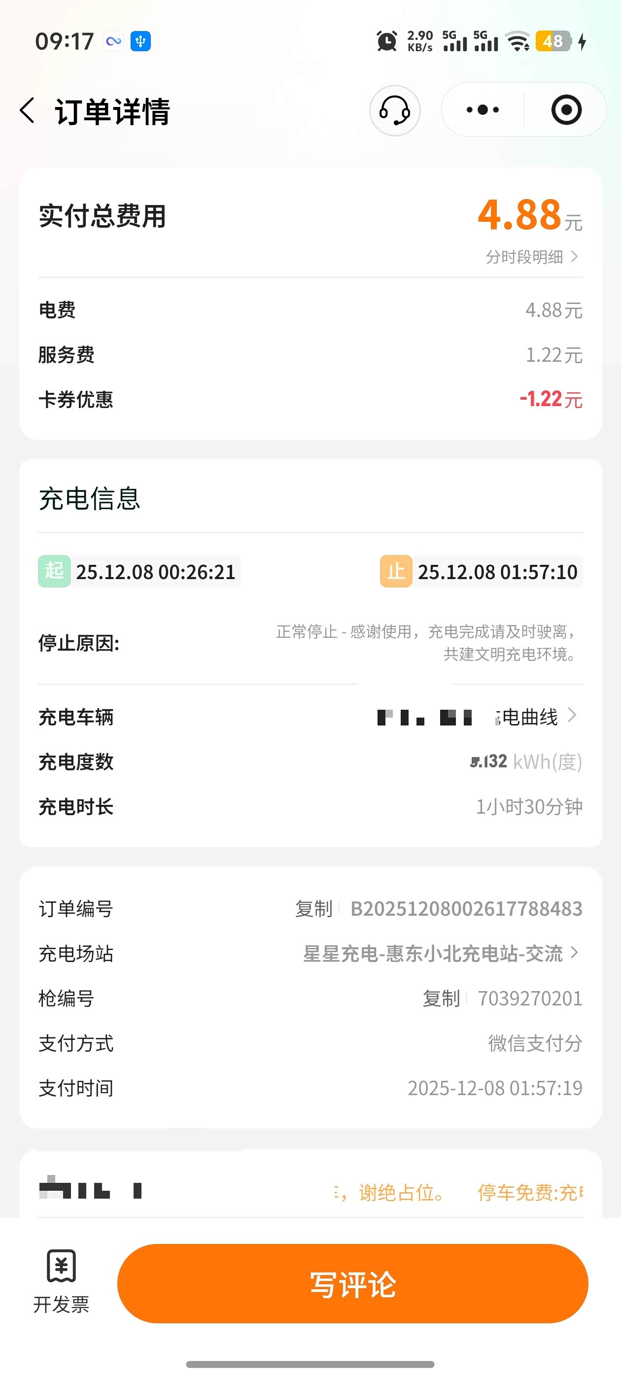 先上硬核账单,不吹不黑:我日常上下班往返全程43公里,前几天凌晨赶谷电在充电站慢充,充了8.132度电,算上卡券优惠后实付就4.88元,连5块钱都不到!掐指一算,每公里成本才一毛出头,对比之前开油车百公里五六十的油费,这差价简直是降维打击。