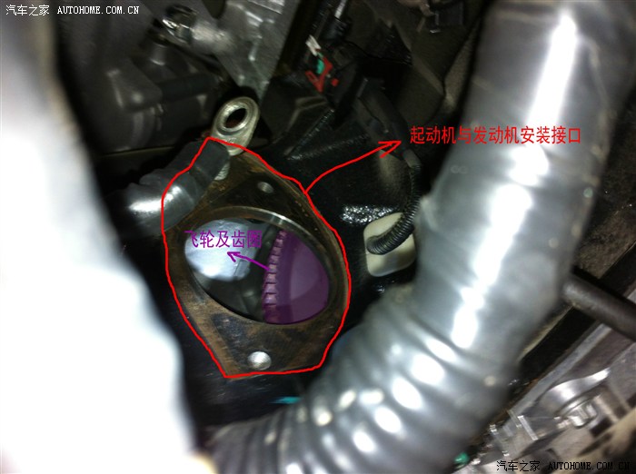 这是拆下起动机后的发动机,一个大窟窿,呵呵,不会漏油滴。可见接口及飞轮齿圈。