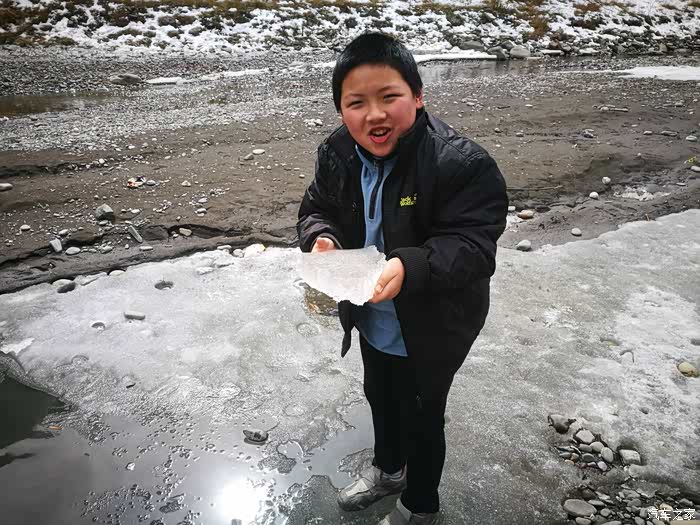 下到河坝,儿子弄了块冰拿在手上,结果没得五秒钟就冷的来拿不住了