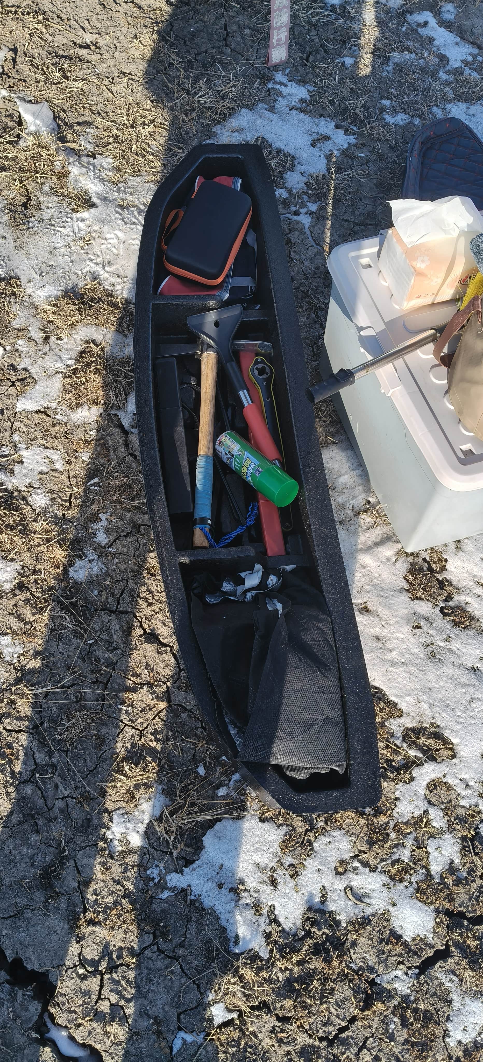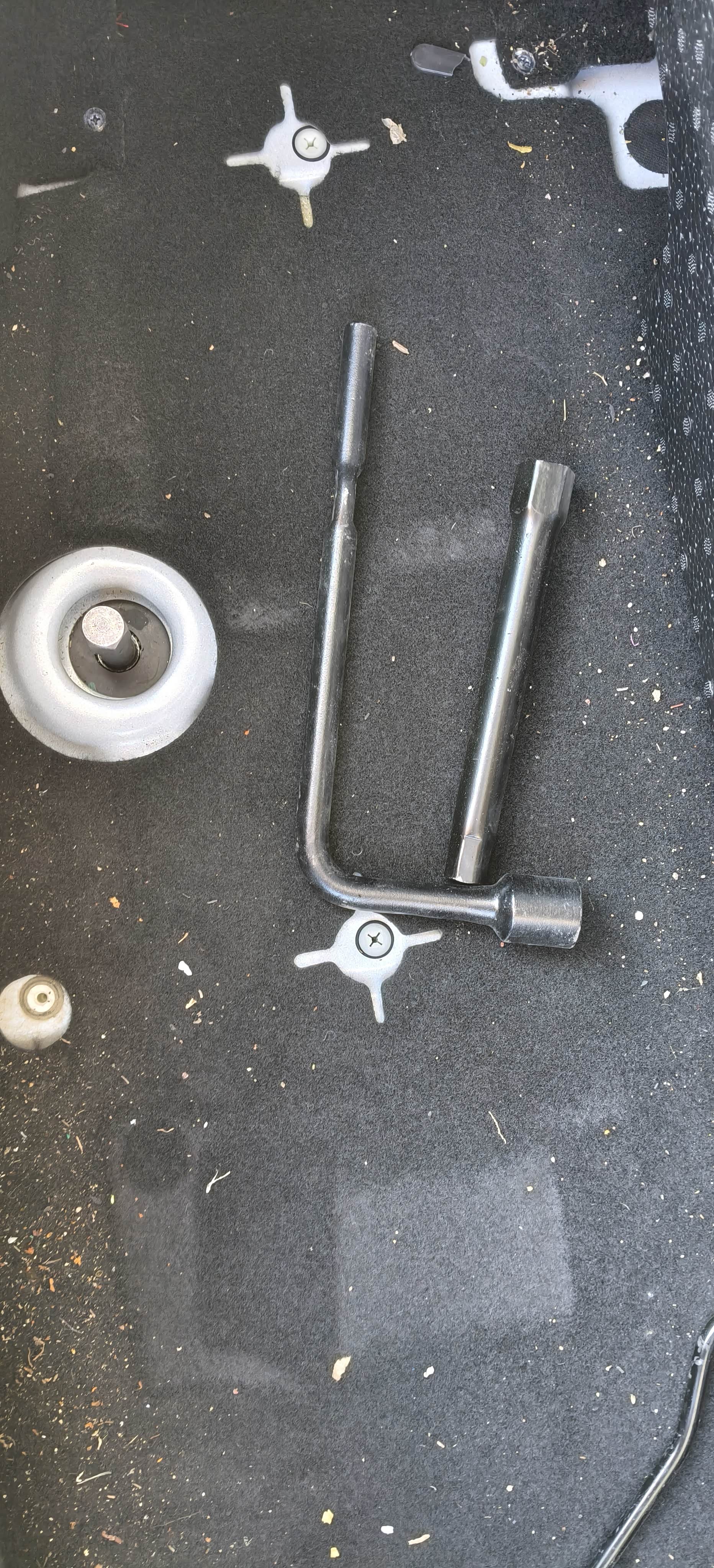 在里面找到工具 卸轮胎螺丝的扳手和车辆的千斤顶(架机)
