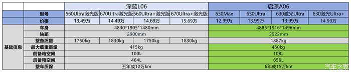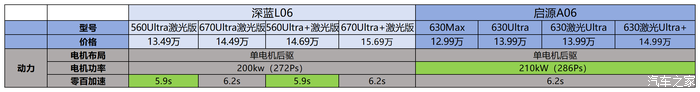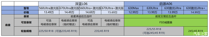 启源A06价格10.99-14.99万元,深蓝L06价格13.49-15.69万元。