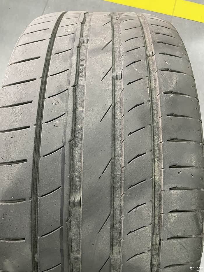 马牌胎,已经变形,这也是为什么胎噪大的原因,胎面形成波浪纹,嗡嗡的,提醒一句,胎压不要超过标准,时间长了就会这样