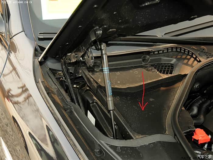 另外就是红色箭头所指下方,会有个橡胶出水垫子,这个垫子设计的排水孔位很小,加之我们平时用车,特别是秋季落叶多的时候,里面会有树叶或其他脏物堵塞排水口,这样一来,一到下雨或是我们洗车的时候,下面会产生大量的积水,久而久之出现霉变,而这个位置又是风道经过的地方,因此需要清理。清理方法也很简单,就是把橡胶排水口往上拔起就行,给他留有充足的排水孔位。