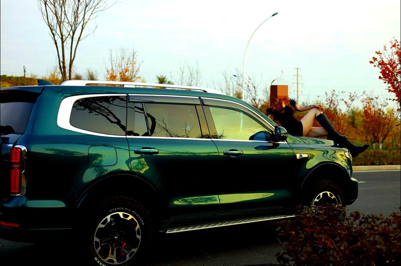 夕阳下,坦克500修长的车身与小姨子的175身高也是绝配
