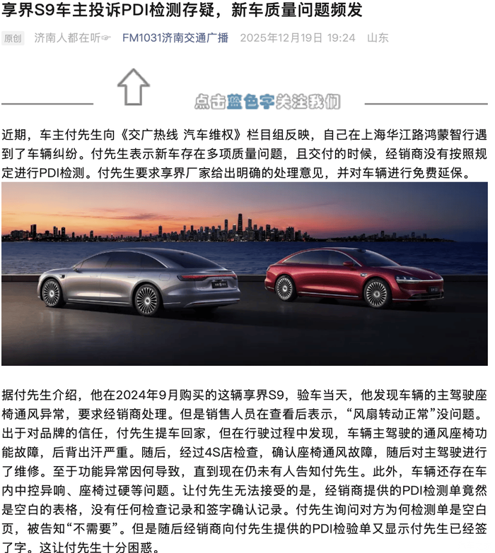 享界S9遭车主诟病:PDI检测存疑,新车质量问题频发
