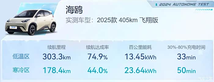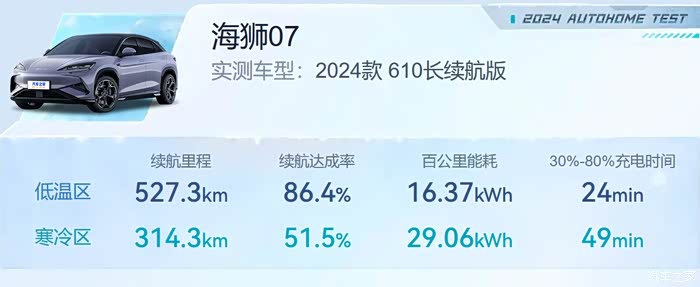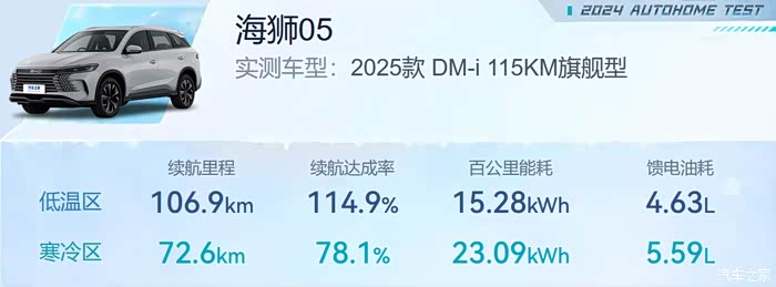 低温区下的续航达成率海狮05 DM-i为114.9%,海鸥低温区下的续航达成率74.9%,海狮07低温区下的续航达成率86.4%。