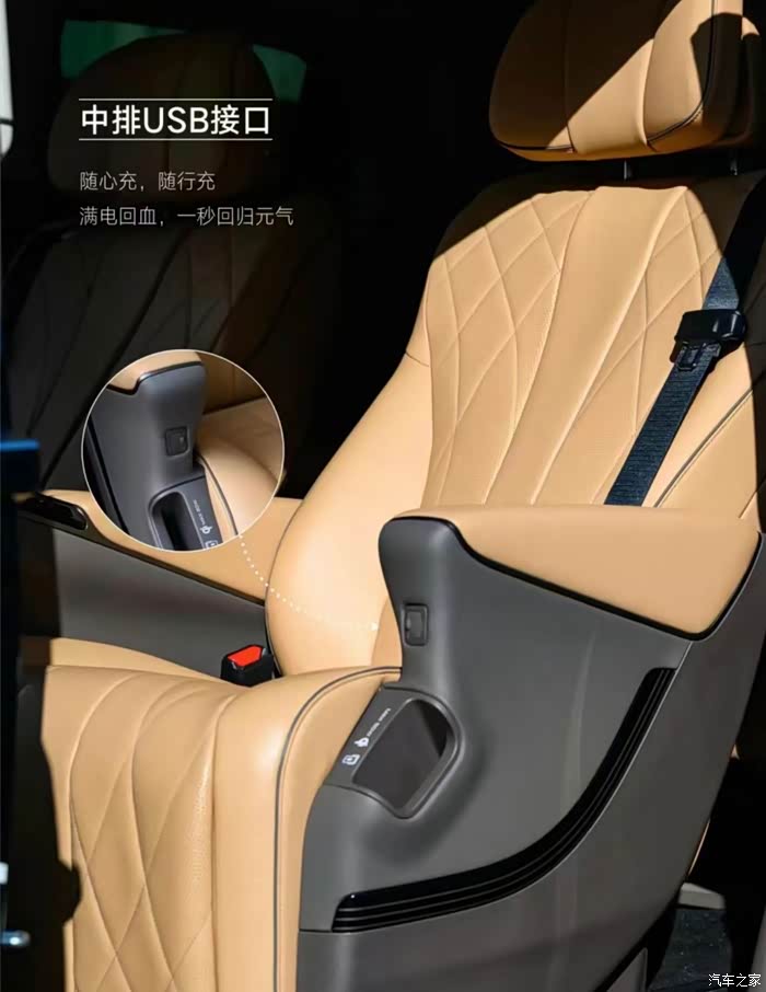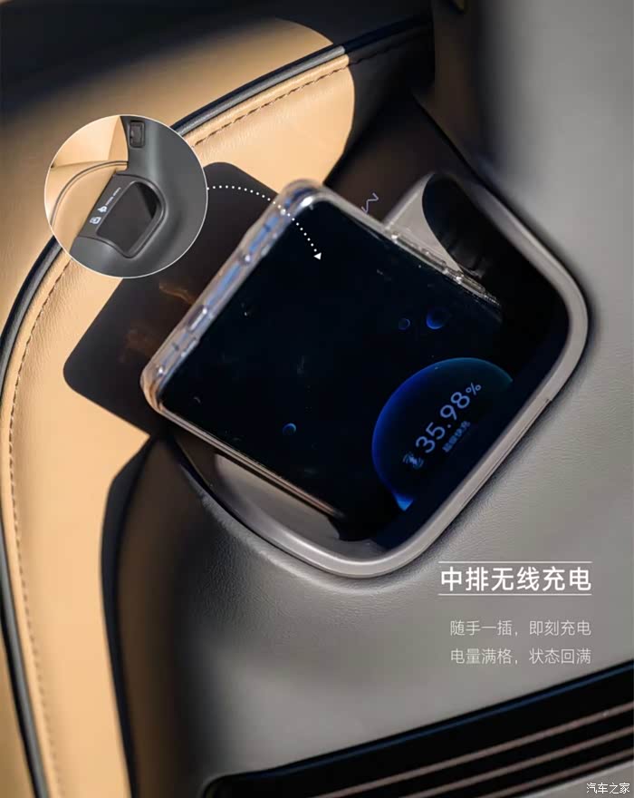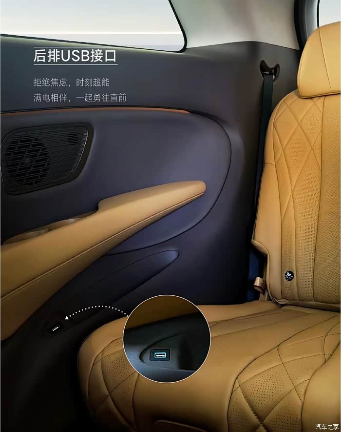 D9配备了3个50W无线超充,加上还有三处U***充电口,分别在全车前中后排,前排在中控台就具有无线快充,另外中控台的下面还有W***接口,Type-A和Type-C的双接口,中排在座椅的侧边就有无线快充口袋和U***接口,后排则是在车门的凹槽处具备了U***接口,所以整车多处充电口,实现充电自由。