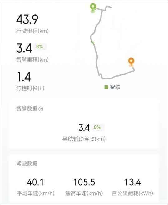 从我最近一次的行驶来看,相应的数据统计还是很真实的,如果使用了智驾功能的路段会标记绿色,在后备箱满载、开着空调的情况下,整体能耗也是真低,仅12.3。