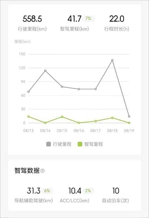 其次是功能体验。打开行程记录功能,整个数据信息还是很丰富的,可以选择数据的时段,一般是以自然周作为统计周期,在上方会告诉你这一周的行程数据,数据展示的方式有折线图,可以精确看到这一周时间每天跑的里程和使用智驾的情况,由于我的是不带激光雷达的版本,在上下班高峰期的通行能力弱一点,所以使用的辅助驾驶相对较低。当然在智驾数据展示的板块,信息也很详尽,有总的辅助驾驶里程、ACC/LCC的行驶里程,还有自动泊车次数。