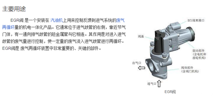 EGR阀分为机械式和电控式两种。工作原理:通过EOJ(Electronic Control Unit)调节EGR阀的开度,从而精确控制进入发动机的废气量,通过废气参与燃烧以降低燃烧室的温度,改善燃烧环境、降低发动机负担、有效减少NOx的排放。在百度上大体搜了一下,大致就是这个作用吧!