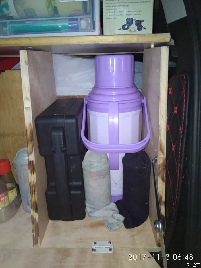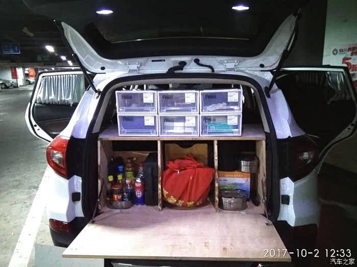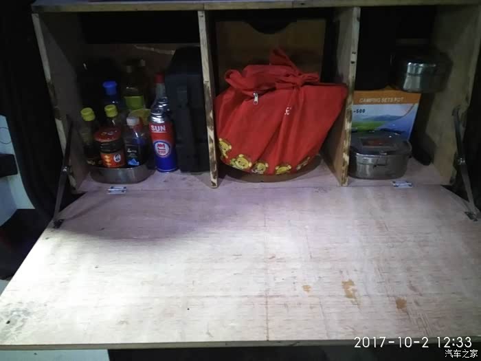 最近连续几年远距离自驾穷游,而且是在车上吃住,感觉做饭的环境应该改进一下,我买过二个小床桌,也买过四椅连桌饭桌,今年又换过折叠桌,多次使用后感觉收放是个大事,体积大占地方,搬上搬下费劲。今年7月,49天新疆南北环游回家后,我又做了改进,上部设置六个抽屉箱,下部设置三个置物箱区,一是暖瓶区;二是炉灶区;三是锅盆区;置物箱根据尾箱斜度制做,下宽上窄,占用空间约30公分,高度42公分,长度一米,箱门为一米长,42公分高,安上铰链,装2个折叠撑杆连接,倒下门板就是一100X40的案板,经过试用,还行!外出不用带桌子了,也不在地上和车头做饭了,现将改进的床车汇报给大家,请多指教。