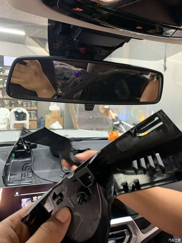 首先拆卸车内镜子后面的壳子~我看师傅用小翘板一下就拆卸来了.很简单.