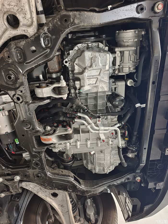 咱们从前往后看,打开了前护板,可以看到前面一个副车架把关键部件前电机和发动机夹在中间,显得特别安全。
